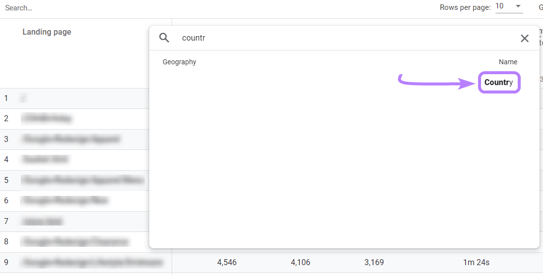 You want to see how many add_to_cart events are occurring by page and by country. Search for "Country" and click it.