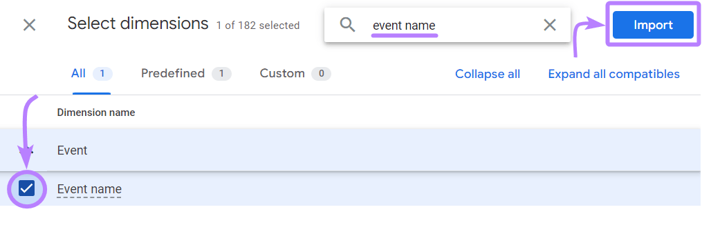 Then, click "Import" to add it to your custom event report.